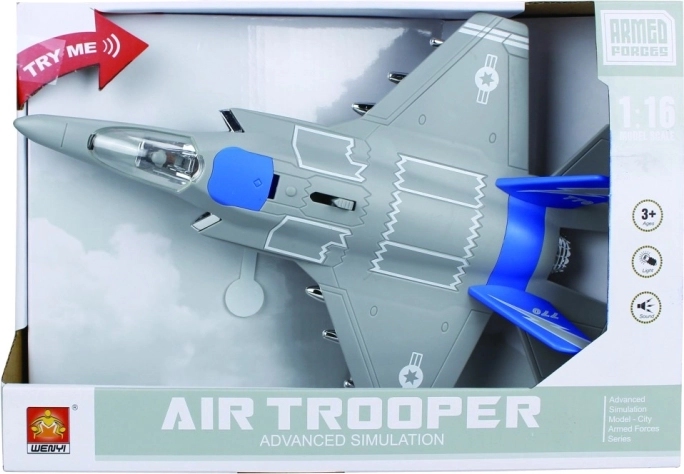Træd ind i luftfartens verden med dette fantastiske militærfly, der imponerer med sin detaljerede udførelse og skala 1:16. Lys- og lydeffekter giver endnu mere realisme, så din lille pilot kan nyde legen fuldt ud uden begrænsninger.