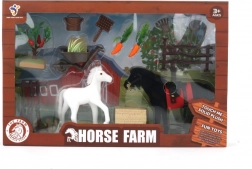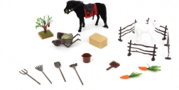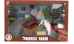 Sættet indeholder alt, hvad der er nødvendigt for at skabe din egen hestefarm, inklusive hestefigurer, landbrugsredskaber og grøntsager.