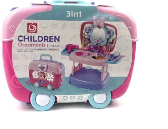 Børne-beautysæt i kuffert med kam, spejl og hårtørrer. Kompakt til rejser, ideelt til små stylingsentusiaster. En fantastisk gave til kreativ leg.