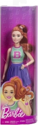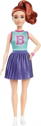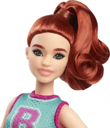 Den præsenterede Barbie dukke har rødt hår i en sidehestehale og inspirerer med sit sporty-friske outfit til at udforske modetrends. Hun bærer en turkis T-shirt med stort 'B' og en sød lilla plisseret nederdel, der suppleres af hvide sneakers og et lyserødt armbånd.