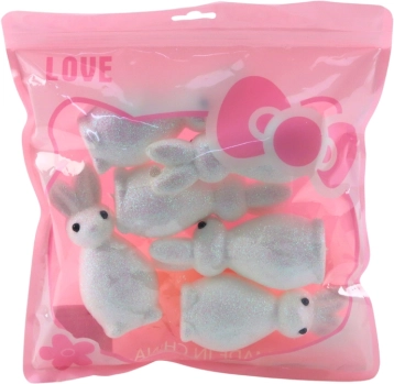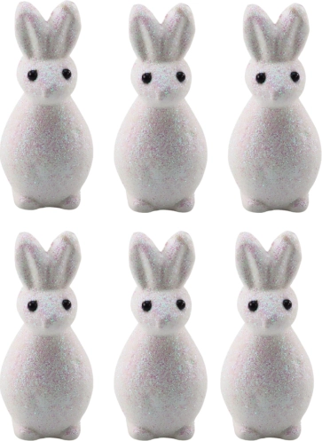 Elegant sæt med 6 hvide styropor-harer med glitrende effekt til charmerende påsktedekorationer. Let og sikker pynt til bordet, kurven og børneværelset, som straks skaber en festlig atmosfære.