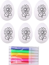 Kreativt sæt til både børn og voksne: 6 lette styropor-æg med blomstermønster og 6 farvede tuscher til nem dekoration. Ideelt til påskekreativitet, udvikling af kreativitet og finmotorik. Æggene har en glat overflade, der er klar til maling, og er perfekte til hjemmehygge, skole og børnehave.