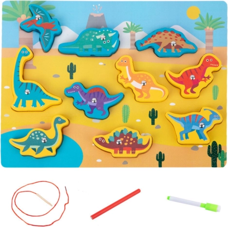 - Udvikling af motoriske færdigheder: Dinosaurusdelene har huller til snortræning, hvilket understøtter udviklingen af manuelle og sensoriske færdigheder.