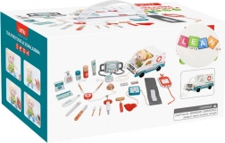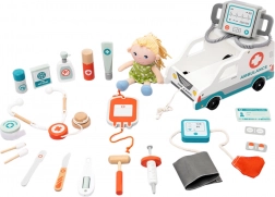 Lad børn blive helte med et realistisk redningssæt. Dette træsæt indeholder medicinsk udstyr som defibrillator, blodtryksmåler, stetoskop og ambulance, som giver legen en høj grad af realisme.