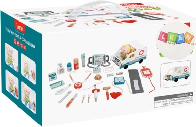 - Antal dele i sættet: 22 dele inklusive defibrillator, stetoskop, blodtryksmåler, skalpel, ambulance og andre medicinske tilbehør.