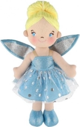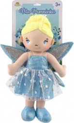 Dukken er klædt i en blå kjole med glitrende vinger, som giver hende et ægte eventyrligt udseende.