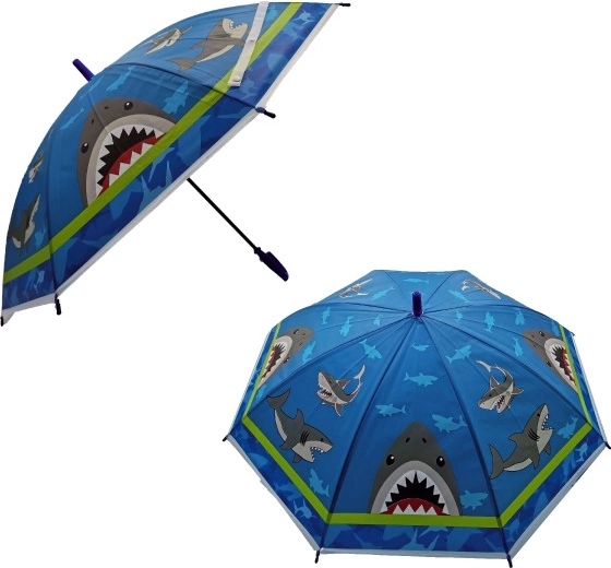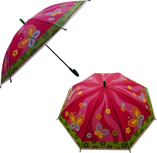 Sommerfugle, ugler, hajer og mariehøns – det farverige mix af motiver gør paraplyen til et populært tilbehør i regnvejr. Varianten vælges efter tilgængelighed.