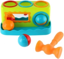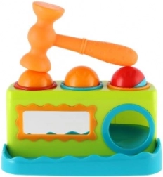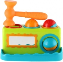 Denne farverige bankebænk i plastik på 21 cm er et glimrende valg til de første udviklende lege. Med hammeren banker børnene sikkert tre bolde ned i de forberedte huller og træner dermed greb, styrke og præcision. Det integrerede spejl på fronten øger interaktion og underholdning.