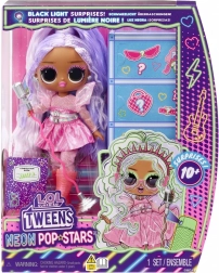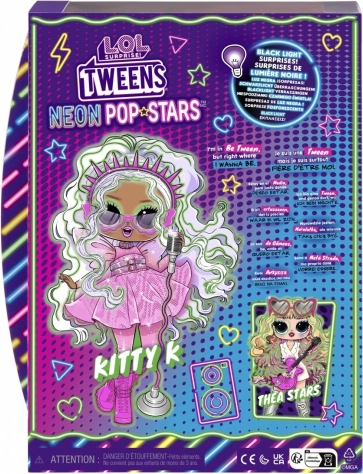 Gå på scenen med Kitty K fra serien L.O.L. Surprise! Tweens Neon Pop Stars – en mode-dukke inspireret af popscenen. Børn vil elske hendes markante look, lange lilla-lyserøde hår og glitrende outfit, der kan kombineres med det rige udvalg af tilbehør. Takket være black light-overraskelser afslører UV-lyset ekstra effekter og motiver, som løfter legen til et nyt niveau.