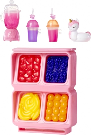 Æskens indhold: Eksklusiv lille søster i outfit, pool med regnbue-rutsjebane, smoothie-bod med blender, frugt og masser af tilbehør. Velegnet til børn fra 3 år.