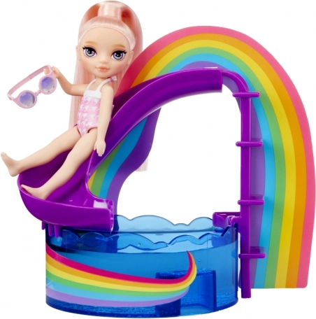 Oplev Rainbow High legesæt med lille søster og pool. Inkluderer regnbue-rutsjebane, smoothie-bod og tilbehør. Den perfekte legetøj til børn fra 3 år.