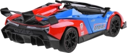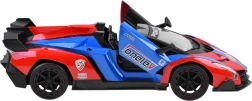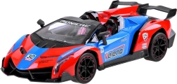 Attraktiv rød-blå-sort karrosseri med aerodynamiske linjer, spoiler og detaljeret udførelse. Dørene kan åbnes direkte fra controlleren for en endnu mere realistisk oplevelse.