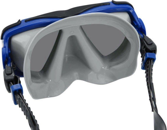 Masken med justerbar rem og blød silikoneforsegling tilpasser sig ansigtsformen og bliver siddende, selv under længere svømmeture. Det ergonomiske mundstykke i silikone er behageligt i munden.