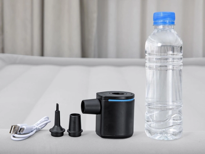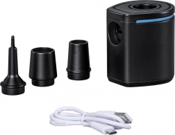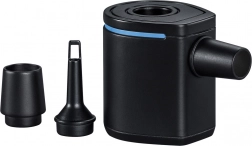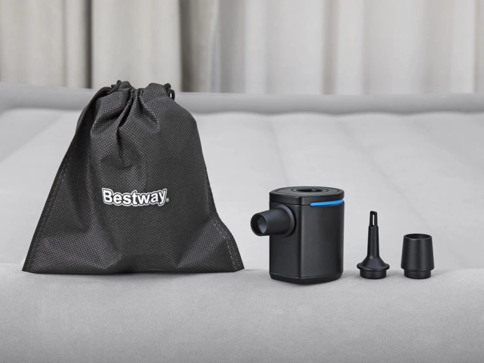 Takket være flow på 90 l/min klarer pumpen hurtig oppumpning og tømning. Betjeningen er intuitiv – der skal blot én knap til. Med tre mundstykker passer den til de fleste almindelige ventiler på oppustelige madrasser, baderinge, liggestole og campingunderlag.