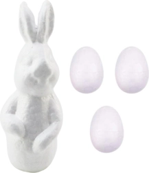 Sættet indeholder en polystyrenkanin med en højde på 15 cm og tre polystyrenæg med en højde på 5 cm. Der medfølger også farver i fire intense nuancer og en pensel, der gør det nemt og præcist at male.