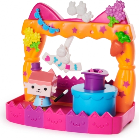 Dette farverige sæt inspireret af Gabby’s Dollhouse forvandler enhver eftermiddag til et magisk show. Byg den lille stjernescene, sæt Baby Box Cat på podiet, og udfør et trylletrick med hatten. Der medfølger også en balkon med løkker til at hænge små rekvisitter samt en hemmelig overraskelseskapsel.