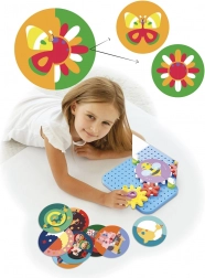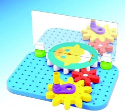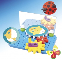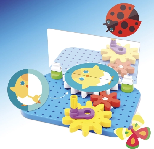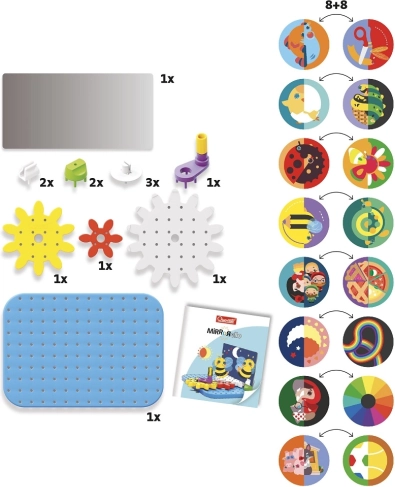 QUERCETTI MIRRORELLO er et kreativt læringslegetøj, der forbinder bevægelsen af tandhjul med en imponerende spejleffekt. Børn drejer håndsvinget, sætter farverige hjul i bevægelse og ser, hvordan de illustrerede skiver spejles til overraskende, altid nye mønstre. Sjov, der samtidig træner øje-hånd-koordination og stimulerer fantasien.