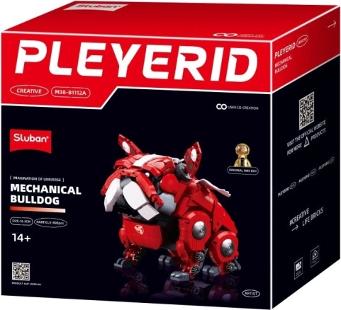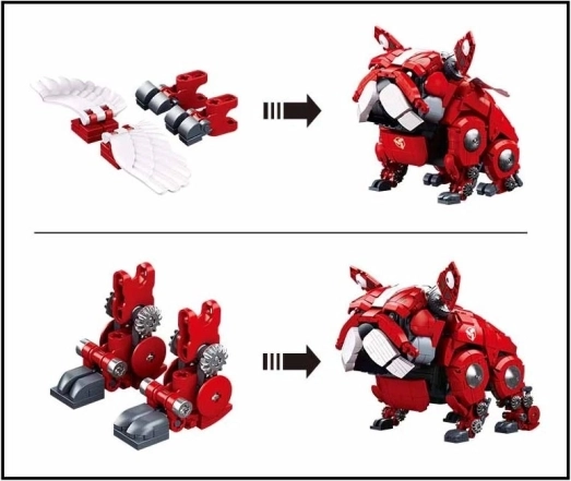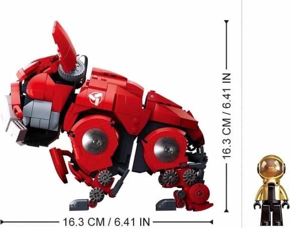 Sluban mekanisk bulldog i rød med bevægelige dele. Kvalitets ABS-plast, kompatibel med LEGO, COBI, MEGA BLOKS. Alder 14+.