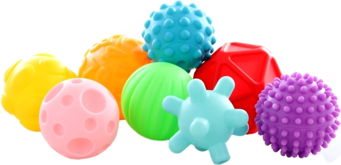 Teksturerede bolde i forskellige farver stimulerer den taktile og visuelle udvikling.