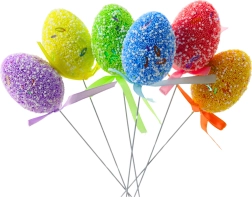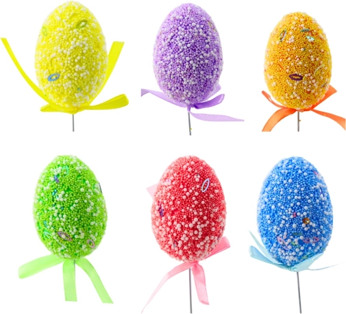 Sættet med dekorative æg på pind er ideelt til hurtig og stilfuld påskeudsmykning. Den strukturerede overflade af skumkugler og diskrete mønstre giver æggene et effektfuldt look, som gør sig godt i blomsterbuketter, altankasser og kurve.