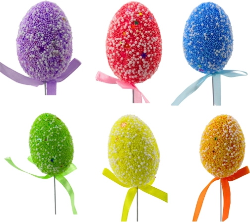 Giv hjemmet påskestemning med et sæt 6 farverige æg på pind. Hvert æg er dekoreret med små kugler og diskrete mønstre, som skaber en attraktiv tekstur. Den matchende satin-sløjfe understreger det elegante look og en ensartet stil.