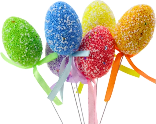 Farverige påskeæg på pind med en stilfuld sløjfe fuldender smukt forårets bordpynt, urtepotter og arrangementer. De lette skumæg med struktureret overflade af små kugler og fine mønstre virker friske og legende, mens en fleksibel tråd gør det nemt at placere dem i dekorationer.