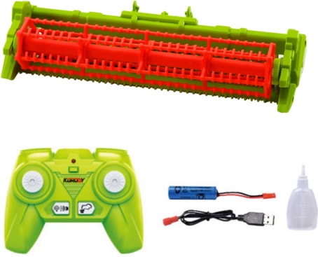 - RC mejetærsker med skærebord, fjernbetjening, akkumulator 3,7 V 500 mAh, USB-oplader, udlosserør, beholder til vand til røg, original emballage