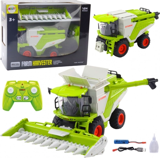 - RC-mejetærsker med majsskærebord, fjernbetjening, batteri 3,7 V 500 mAh, USB-oplader, udlæsningsrør, vandbeholder til røgeffekt, original emballage