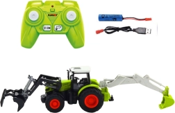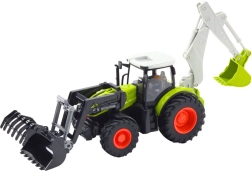 Den realistiske traktor i skala 1:24 kombinerer landbrugs- og anlægsarbejde i ét. Den forreste skovl er drejelig, den bageste arm fungerer som en lille gravemaskine, og LED-lys giver en flot effekt selv i dæmpet lys. Gummihjul og delvist metalforstærket konstruktion klarer intens leg både inde og ude.