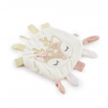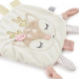 En blød, kvadratisk nusseklud med rådyngel-motiv er den ideelle første ven for baby fra fødslen. Takket være blødt materiale, forskellige teksturer og en knitrende folie stimulerer den sanserne, fremmer nysgerrighed og skaber en følelse af tryghed ved sengetid. Den er let at gribe selv for de mindste hænder og glæder med dæmpede farver samt praktisk nem vedligeholdelse.