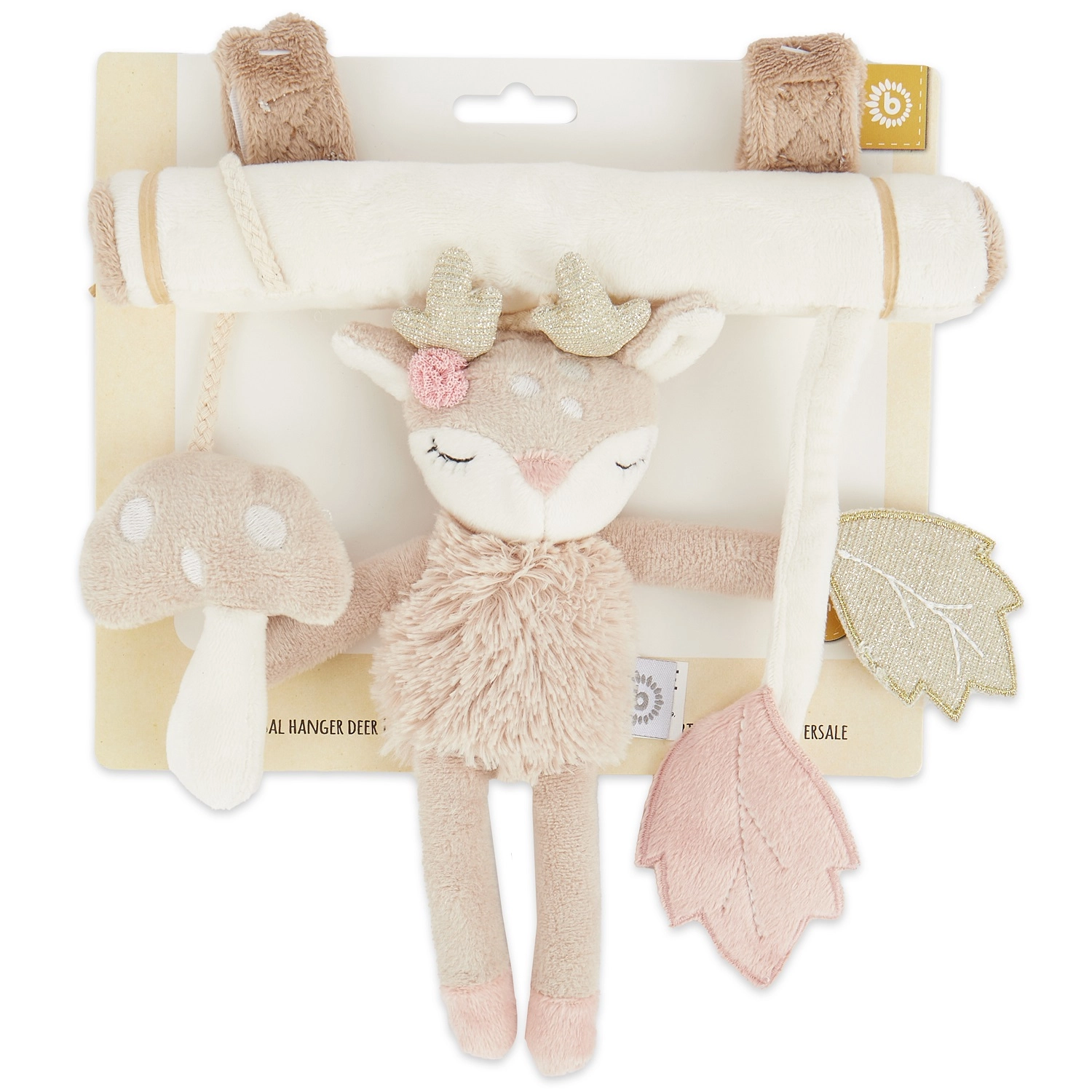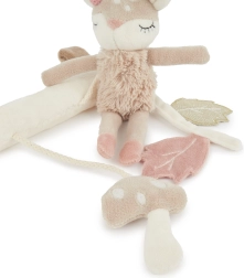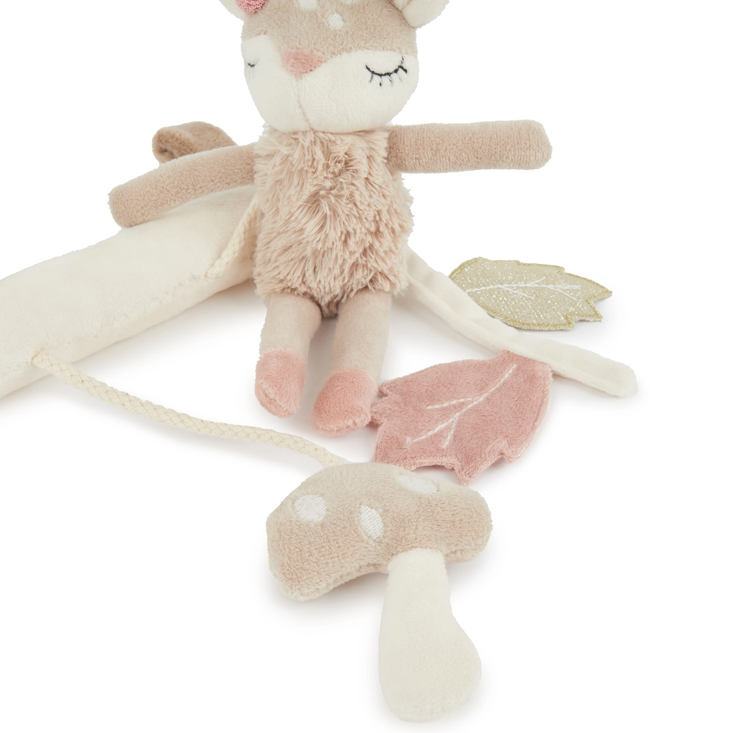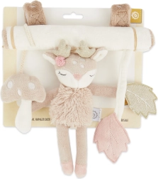 Det søde hængende legetøj med motiv af rådyret Ella glæder babyer fra fødslen og støtter deres udvikling. Takket være praktiske velcrolukninger kan det nemt fastgøres på klapvogn, autostol eller aktivitetsbøjle. Legetøjet giver sansemæssig stimulering med forskellige teksturer og lyde: bladene knitrer, rådyret rasler, og svampen vibrerer/spinder behageligt. Det er fremstillet af blød og lækker polyester, skånsom mod babyens sarte hud.