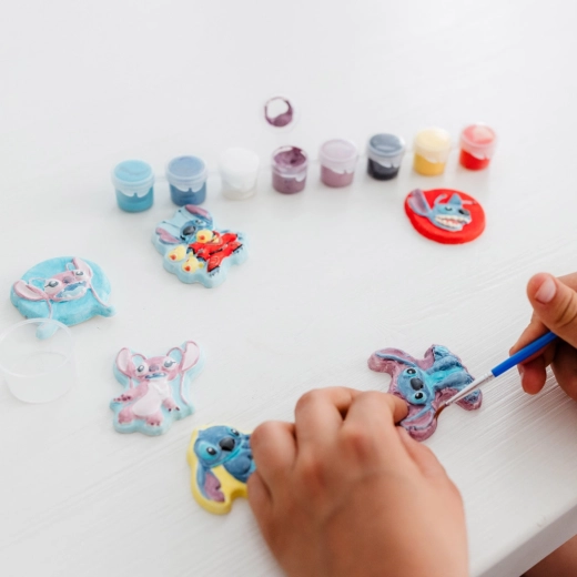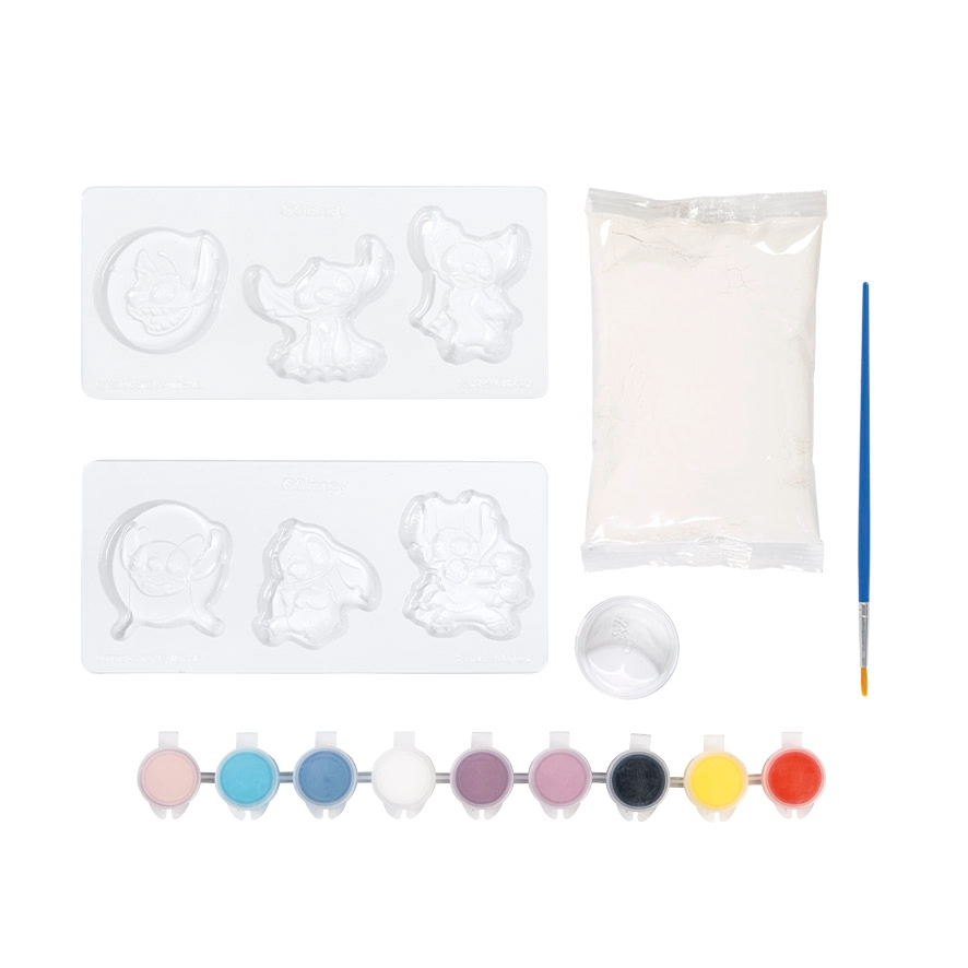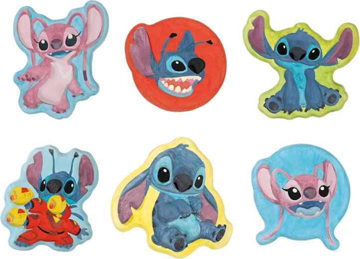 Den anden del af sættet vil glæde alle små kunstnere: ved hjælp af gips og forme laver I søde figurer af STITCH og ANGEL, som I efterfølgende maler med de medfølgende farver. En blød pensel og et praktisk målebæger gør arbejdet lettere – også for begyndere.