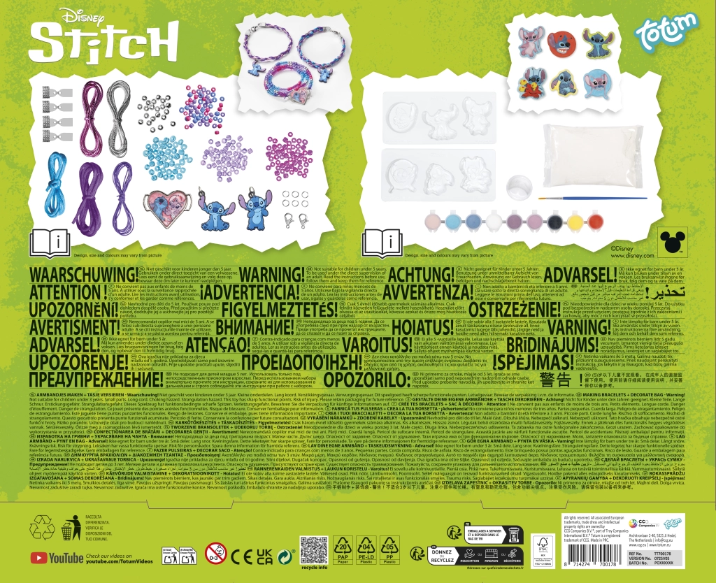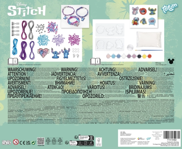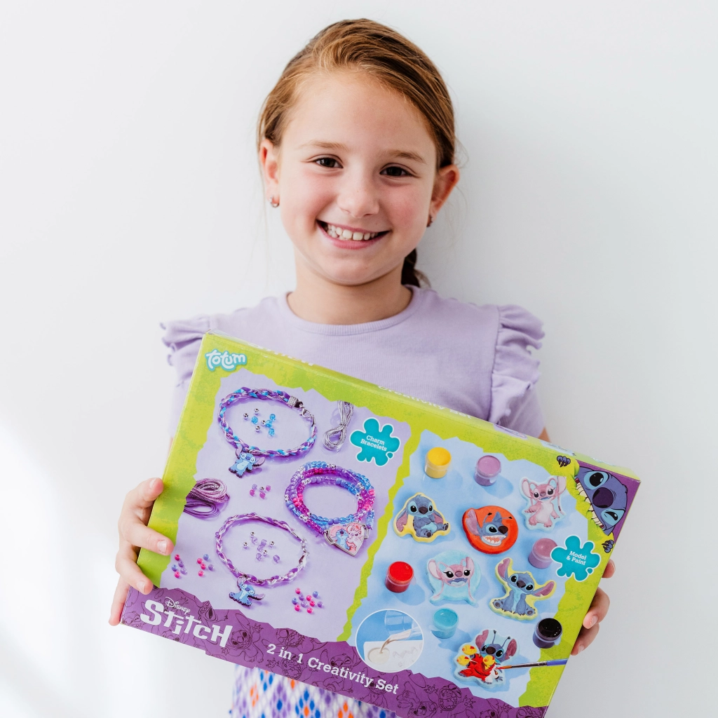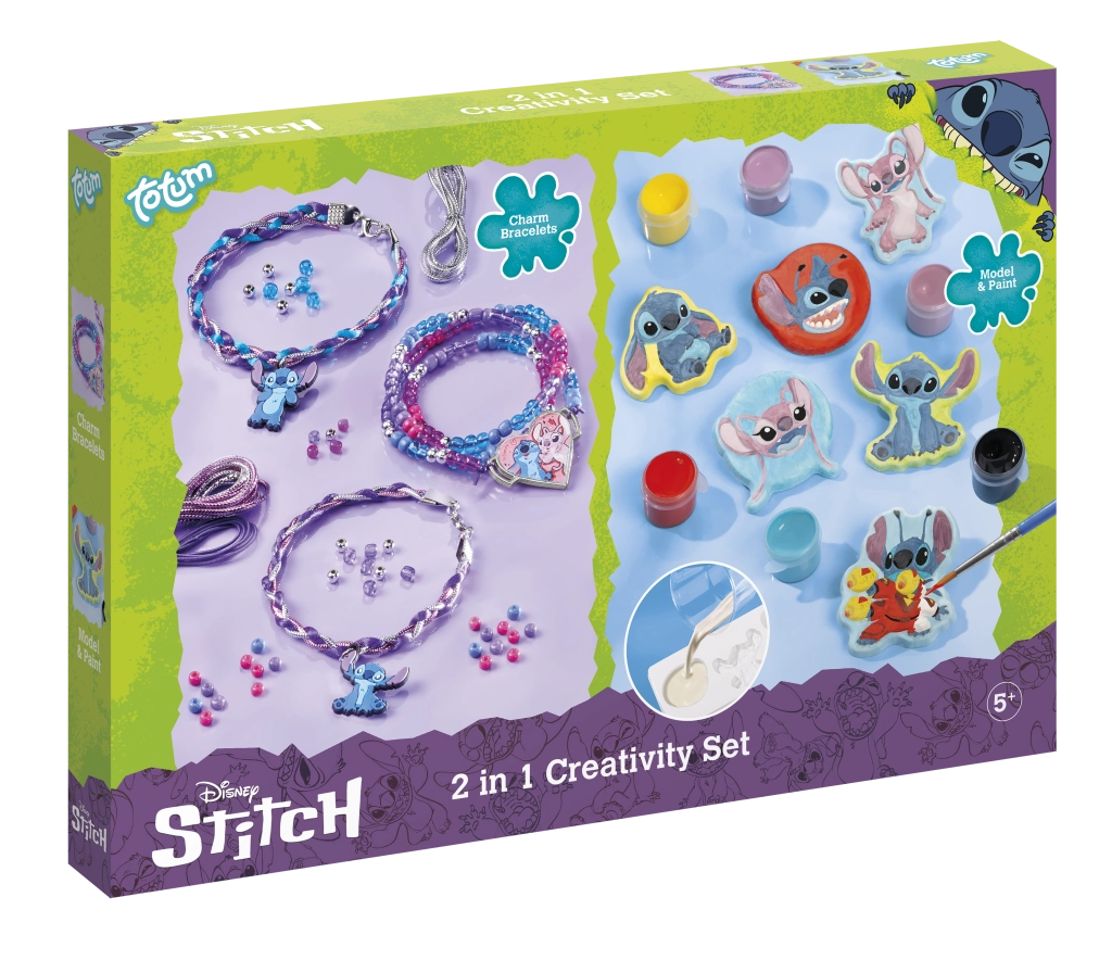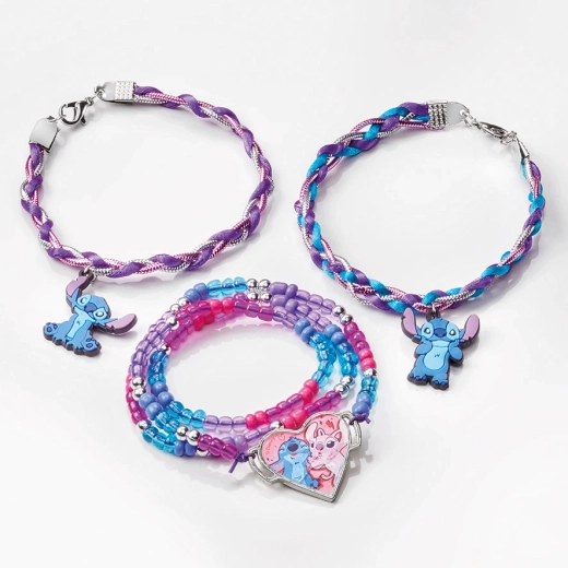 Dette alsidige kreative sæt forbinder to populære aktiviteter – smykkekunst og maling. Børn kan nemt lave op til tre armbånd: to af satinsnore i klare farver og ét perlearmbånd med glas- og metalglinsende perler. De pyntes med premium gummivedhæng med STITCH og et stort hjertevedhæng med motiv af STITCH og ANGEL.