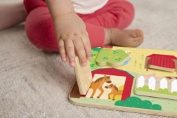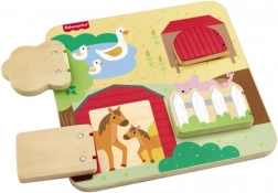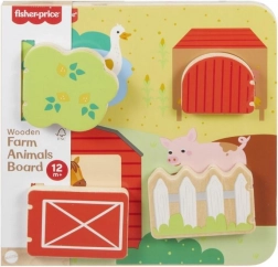 Opdag glæden ved læring med træspillepladen fra Fisher-Price, der tilbyder dit barn både sjov og udvikling af finmotorik med bondegårdsdyr.