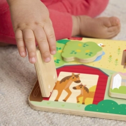Spillepladen indeholder 4 døre, der kan åbnes og afslører forskellige venlige dyr og deres unger. Dørenes størrelse er ideel til små hænder, hvilket gør det nemt at håndtere og fremmer udviklingen af finmotorikken.