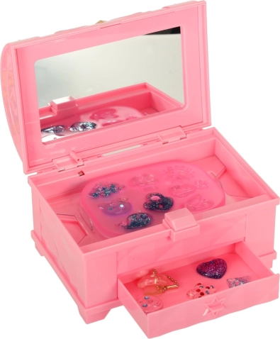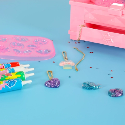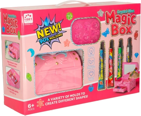 Magisk boks er et fantastisk kreativt sæt, der gør det muligt for børn at skabe personlige smykker ved hjælp af farvet lim. Sættet indeholder fire tuber lim i farverne rød, grøn, blå og hvid samt fire forme i forskellige figurer. Supplerende dekorative elementer som glimmer og små krystaller gør det muligt at personliggøre smykkerne efter egen fantasi. Der medfølger også fil og pincet.