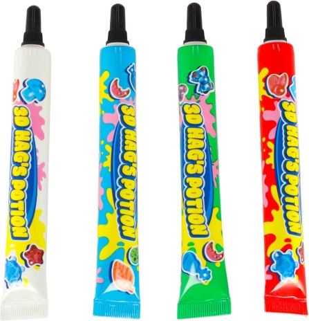 Sættet indeholder fire tuber lim i forskellige farver og forme med forskellige mønstre.