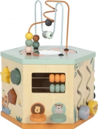 Opdag en alsidig motorisk aktivitetsterning i træ med safari-tema, der byder på 7 legeflader fyldt med sjov og læring. Børn vil elske perlelabyrinten, skydesporene, puttekasserne, tæller, xylofon og tandhjul. Terningen understøtter fin- og grovmotorik, øje–hånd-koordination og sanseopfattelse. Praktisk er også det indre opbevaringsrum til formene og det vendbare låg med labyrint for at spare plads.