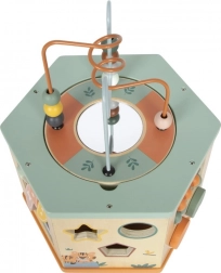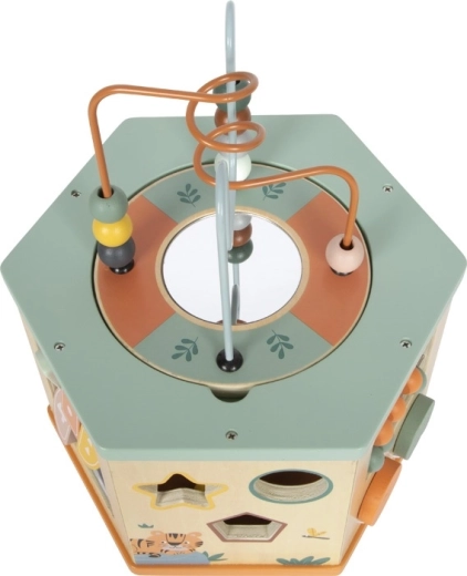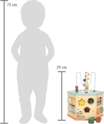 Denne robuste træ-aktivitetsterning i blide natur- og pastelfarver med safari-dyr tilbyder et rigt udvalg af aktiviteter til både leg og færdighedsudvikling. Børn kan udforske perlelabyrinten, flytte elementer i sporene, sortere former, spille på xylofonen og træne logik og koncentration.