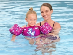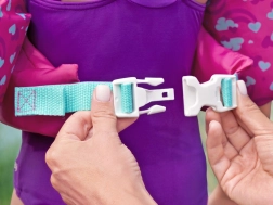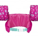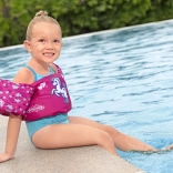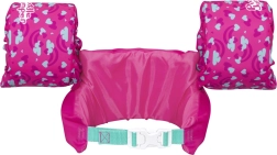 Armbåndene er forbundet med bryststykket, hvilket hjælper med at holde armene over vandoverfladen og opbygger selvsikkerhed hos små svømmere. Takket være den universelle pasform sidder det komfortabelt og begrænser ikke bevægelsen ved plask, leg og de første svømmeforsøg.