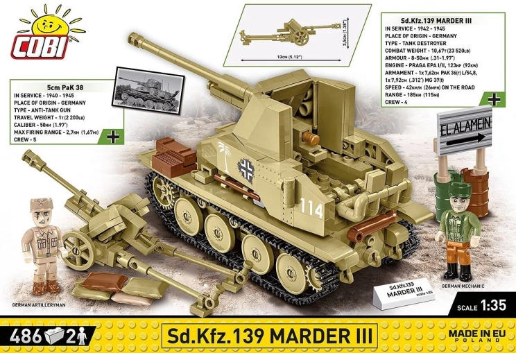 Pakken indeholder to minifigurer (tysk mekaniker og artillerist), feltskyts 5 cm Pak 38 og en vejviser EL ALAMEIN inspireret af historiske fotos. Byggesættet er fremstillet i EU, opfylder sikkerhedsstandarder og er fuldt kompatibelt med andre mærker af byggeklodser.