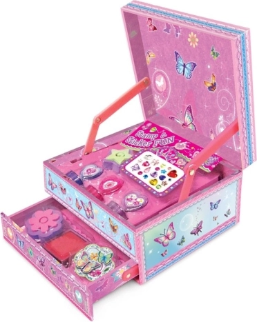 Et sødt stempelsæt med sommerfuglemotiv fra PECOWARE, der glæder både små og store skabere. Det er anbragt i en dekorativ æske med selvåbnende skuffe – en ideel kreativ gave til hjemmelavede projekter.