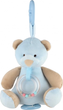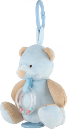 Den søde blå bjørn med musik-/raslefunktion og ophængsklip beroliger baby både hjemme og på farten. Den er blød, børnesikker og takket være de dæmpede farver passer den i enhver babyudstyrspakke. Den gennemsigtige ring med perler giver lydstimulering, klipsen muliggør nem ophængning på barnevogn eller autostol, og den behagelige plys understøtter indsovningen.