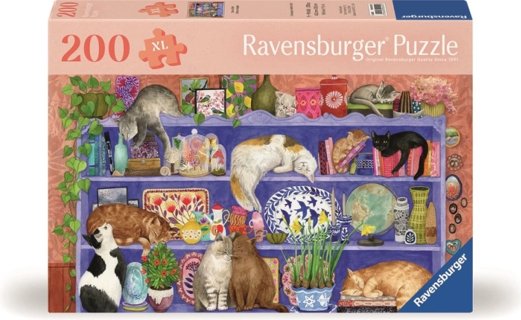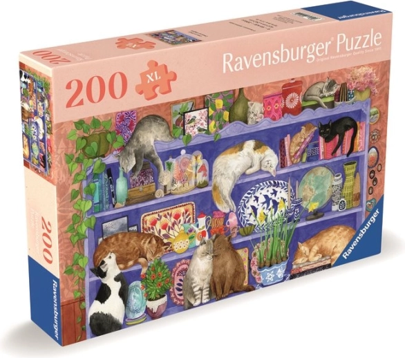 Nyd at lægge puslespillet Katte på Hylden fra Ravensburger med 200 brikker og størrelsen 49 x 36 cm.