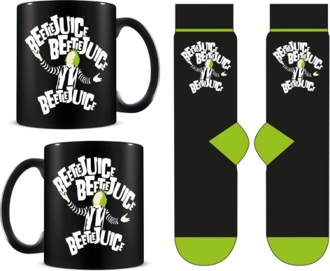 Herre-gavesæt BEETLEJUICE: keramisk krus 315 ml til opvaskemaskine og mikrobølgeovn + behagelige sokker 41–45. En fantastisk gave til fans.