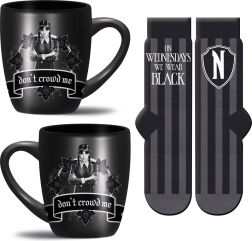 Leder du efter en kreativ gave til fans af WEDNESDAY? Dette praktiske sæt kombinerer daglig komfort og stil. Det keramiske krus på 315 ml er ideelt til kaffe og te og kan uden bekymring tåle både opvaskemaskine og mikrobølgeovn. De bløde strømper i den universelle størrelse 36–41 er behagelige at have på og tilpasser sig let foden.