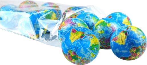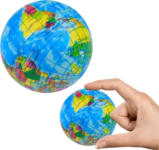 Antistressbold globus 6 cm i blødt skum. Stressreduktion, styrkelse af motorik og sjov læring om kontinenter. Ideel til skole, arbejde og rejser.