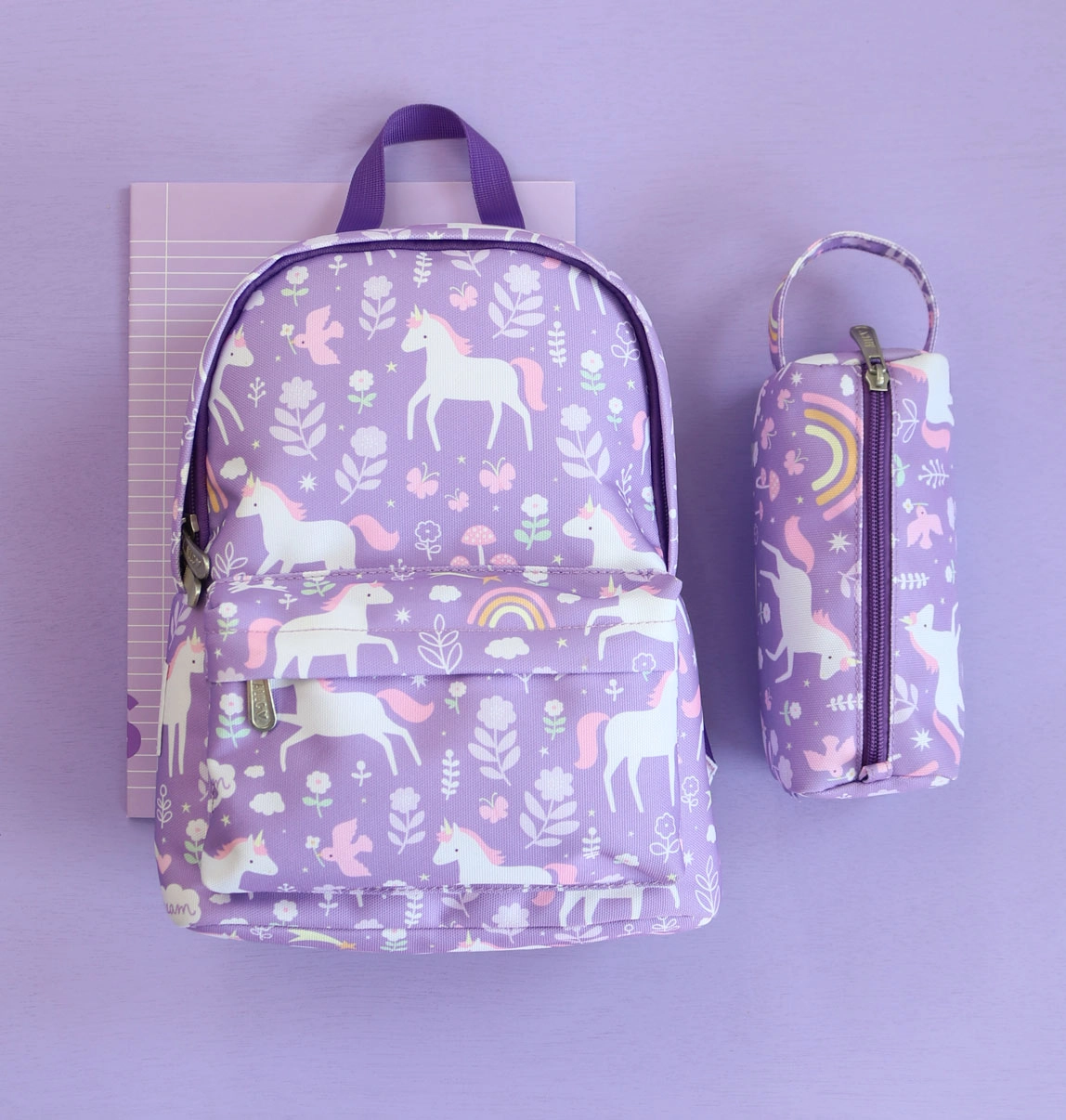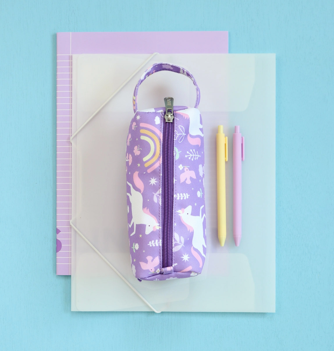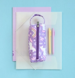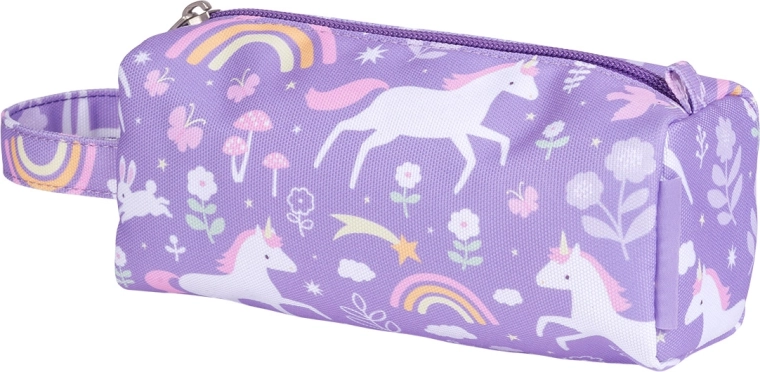 Lilla etui til farveblyanter, tuscher eller skriveredskaber med motiver af enhjørninger, blomster og regnbue, lavet af bæredygtigt polyester. Perfekt til skole, rejser eller hobby, lukkes med lynlås og har et behageligt håndtag for nem bæring. Sikrer sikker opbevaring af dine skriveredskaber.