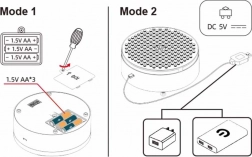 Spil og lys hvor som helst. Tilslut USB 5 V for kontinuerlig drift, eller brug 3× AA-batterier, når du er uden stikkontakt. Alt styres nemt med en separat funktionsafbryder.