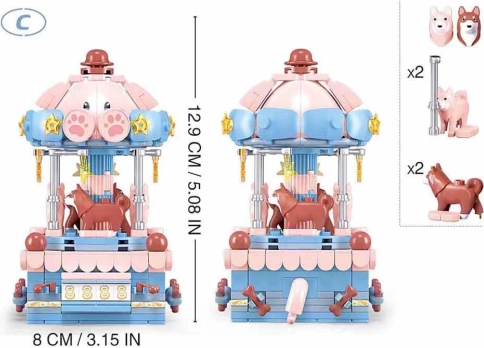 Delene er lavet af ufarlig, holdbar ABS-plast og er fuldt kompatible med andre populære byggesystemer. Serien tilbyder 3 motiver (kat, hund, bjørn), så du kan skabe en hel samling af søde karruseller.